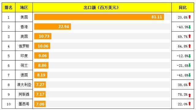 LED显示屏产品出口市场规模从2012年的6.24亿美元增长至2016年12.87亿美元,年均增幅24.5%。以2017年第一季度中国LED出口情况为例: